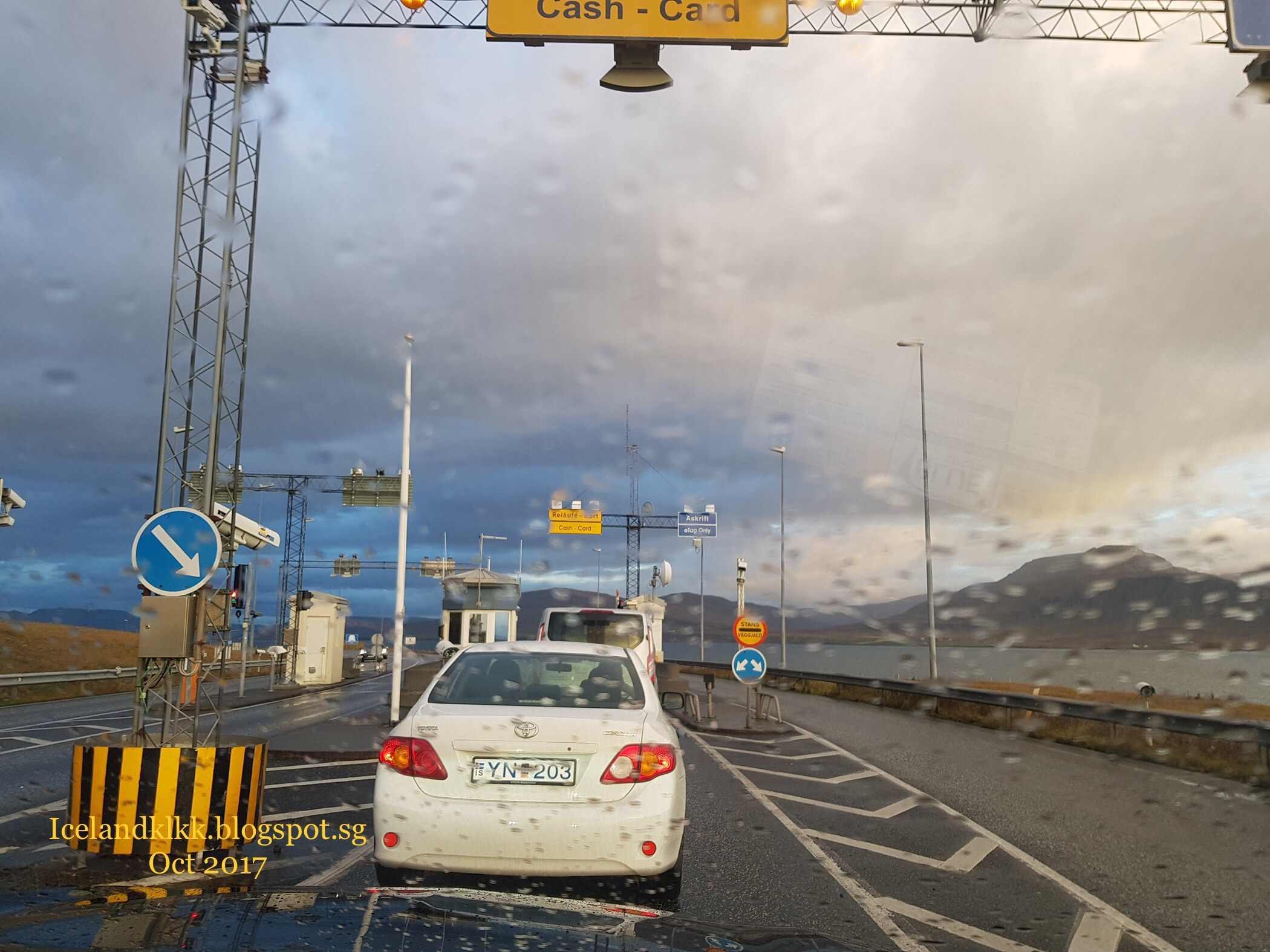 天天气对我们可真好,每天让我们可以顺利度过每一个景点。直到回城的路段才下了些小雨。只是路滑,驾慢一点就好。车子开进雷克雅未克Reykjavík 之前,必须经过一个收费站,这也是我们在冰岛看到的唯一一个站,收费现金1000克朗kr (13新币)。