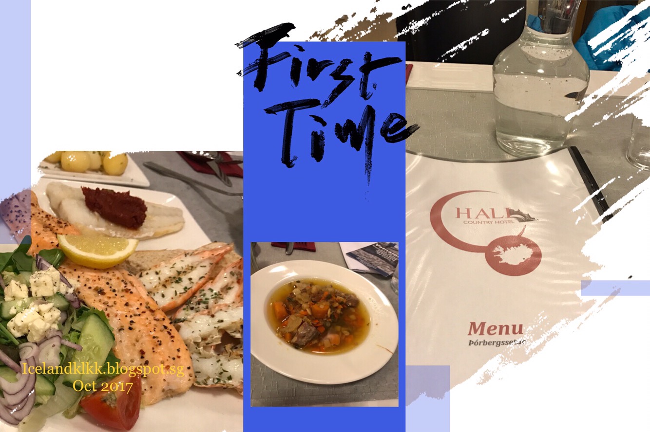哈利乡村旅馆附近只有他们这个小村,餐馆也只有他们这一家。我们抵达是太阳刚刚下山,餐馆离旅馆不远,我们先在餐馆点了lamb soup,Arctic char and lobster tails(羊肉汤,鱼排和龙虾套餐)。