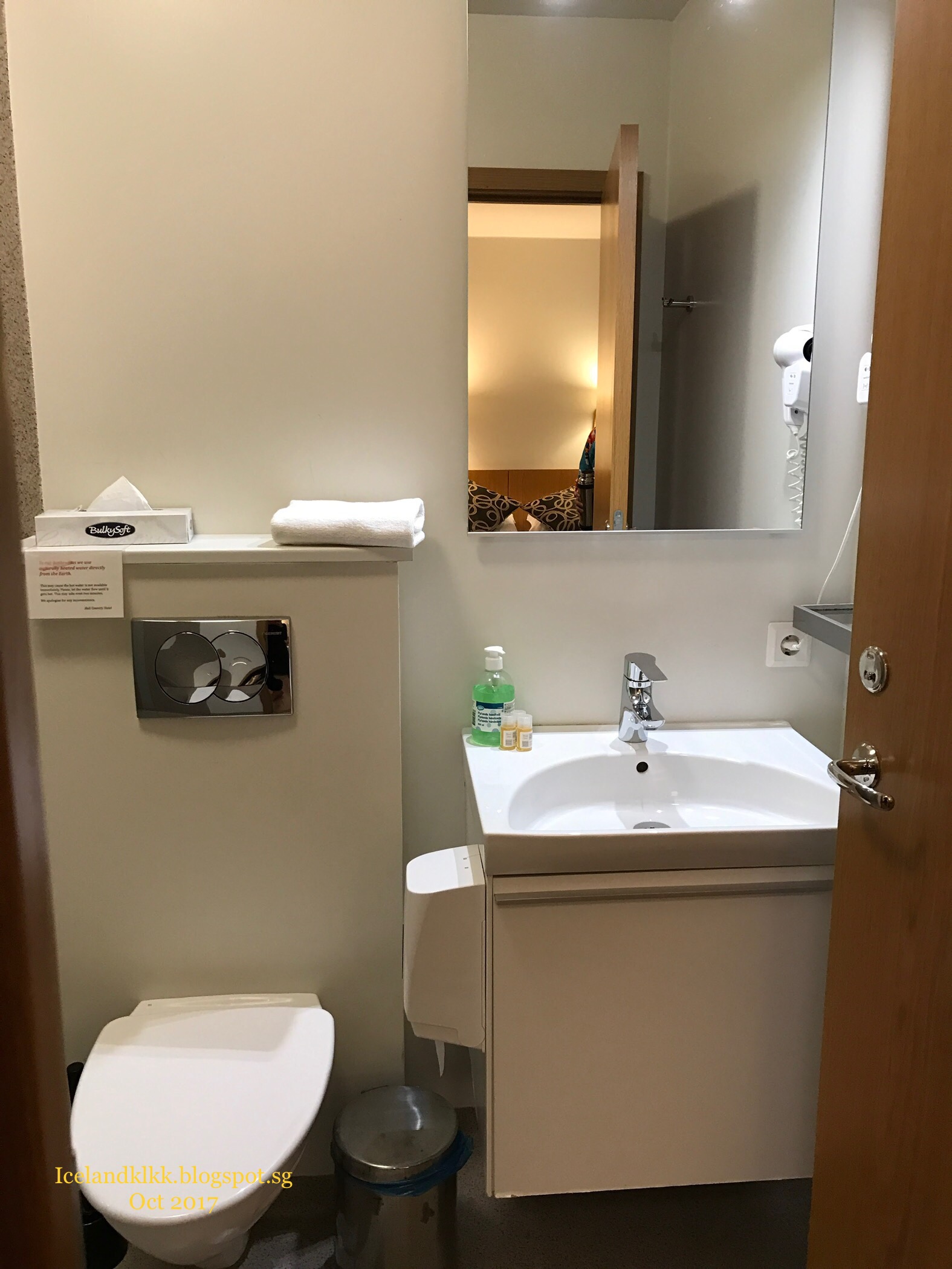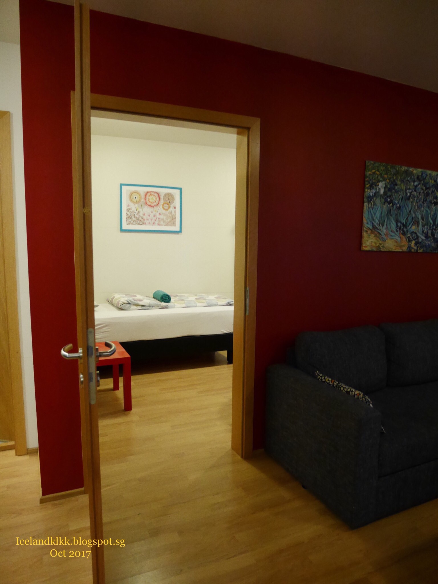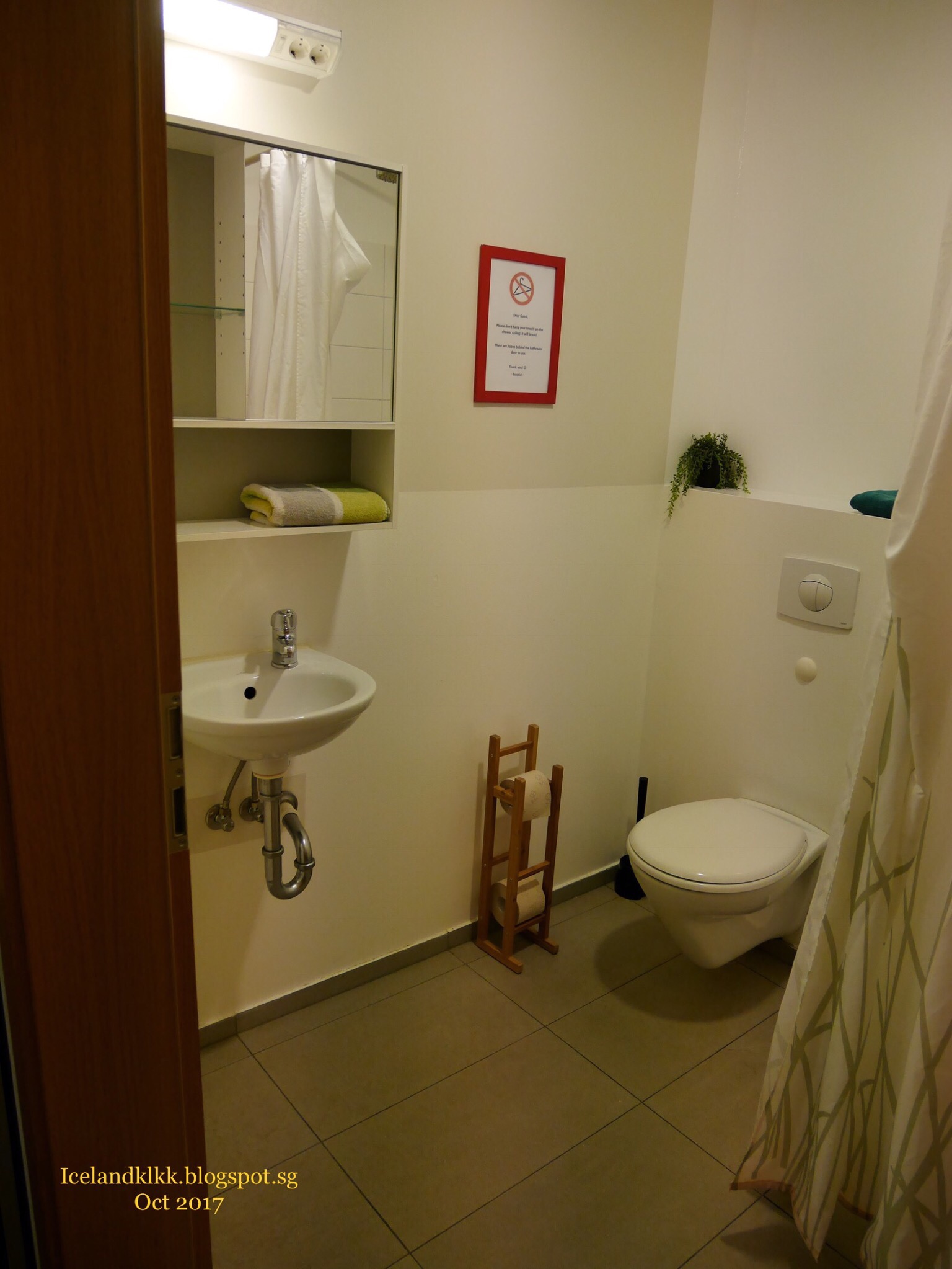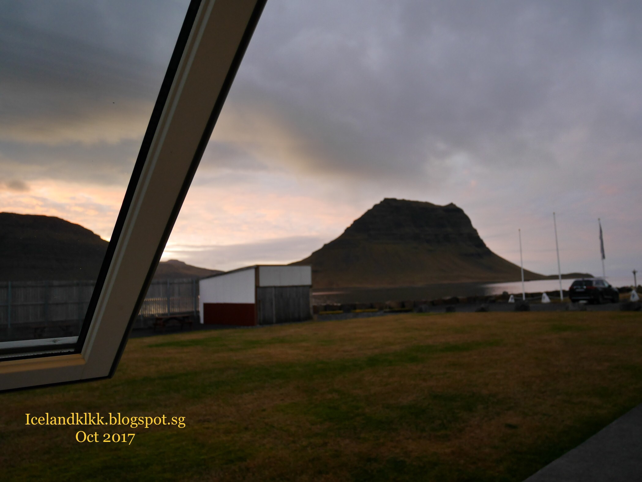 抵达后,把行李搬进去,门前有鞋架、垃圾分类箱和临时locker,屋内也是五脏俱全,客厅有个double taker,微波炉、碗盘、锅、热水壶、刀叉都齐全,还有可爱的厕纸。屋里面还有一间小房,小房里有两张单人床,最大的惊喜是客厅和卧室的窗户外,竟然可以直接看到草帽山Kirkjufell
