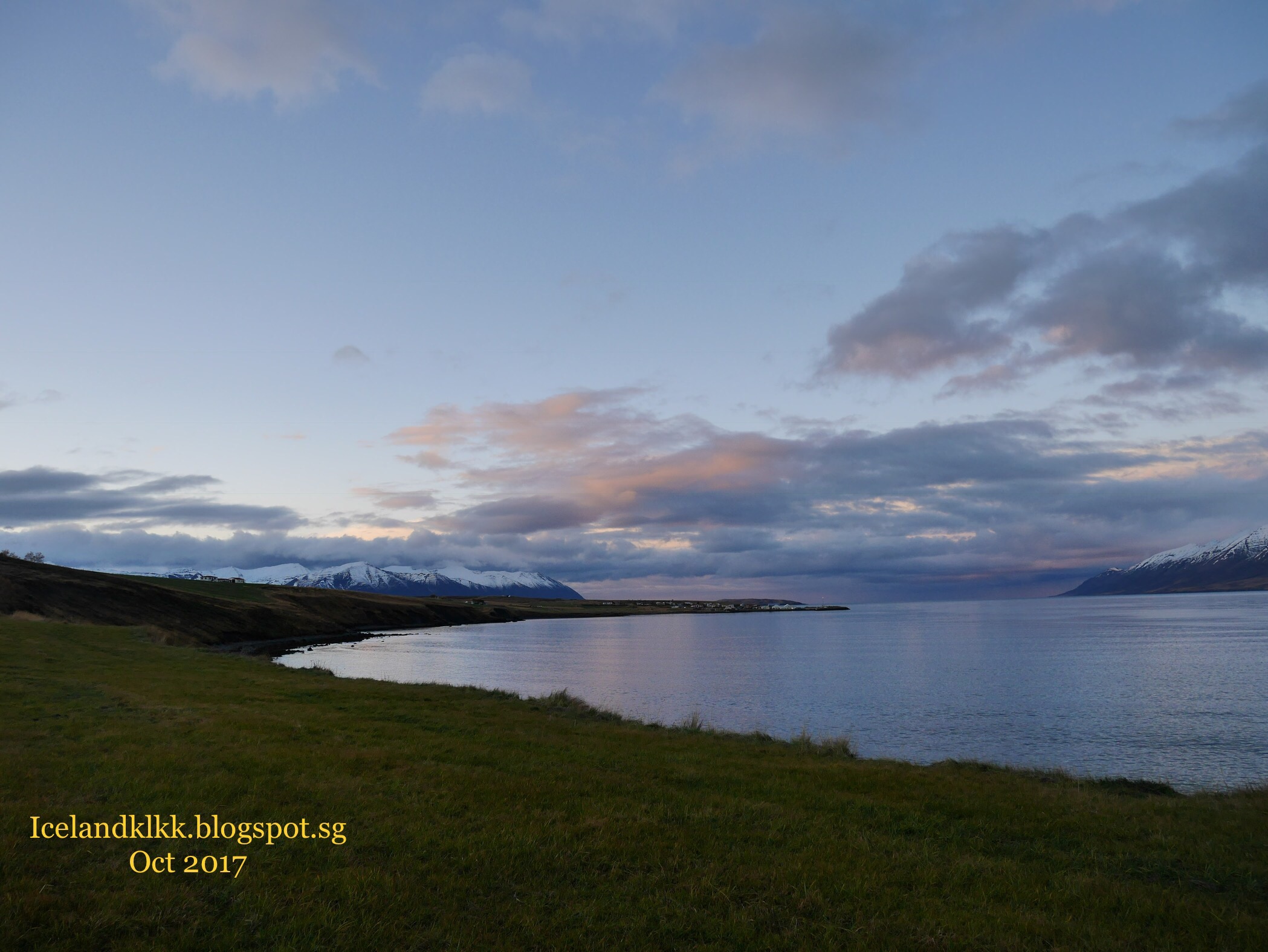 到了隔天,队友说外面的池是暖的!我们在阿克雷里Akureyri 市区走走逛逛吃吃喝喝半,还有看看他们市里独有的红色爱心的红绿灯,半天后,再打包一些汤、还有明天的早餐面包,就回屋了。回到时,先到屋外拍些风景照。看来很难找到和这个度假屋媲美的景色:屋前是湖、湖外有雪山、湖边有小村、村后又有雪山!海山成一色,这景真是一绝!当然,要到屋外拍照,厚外套还是必须的。