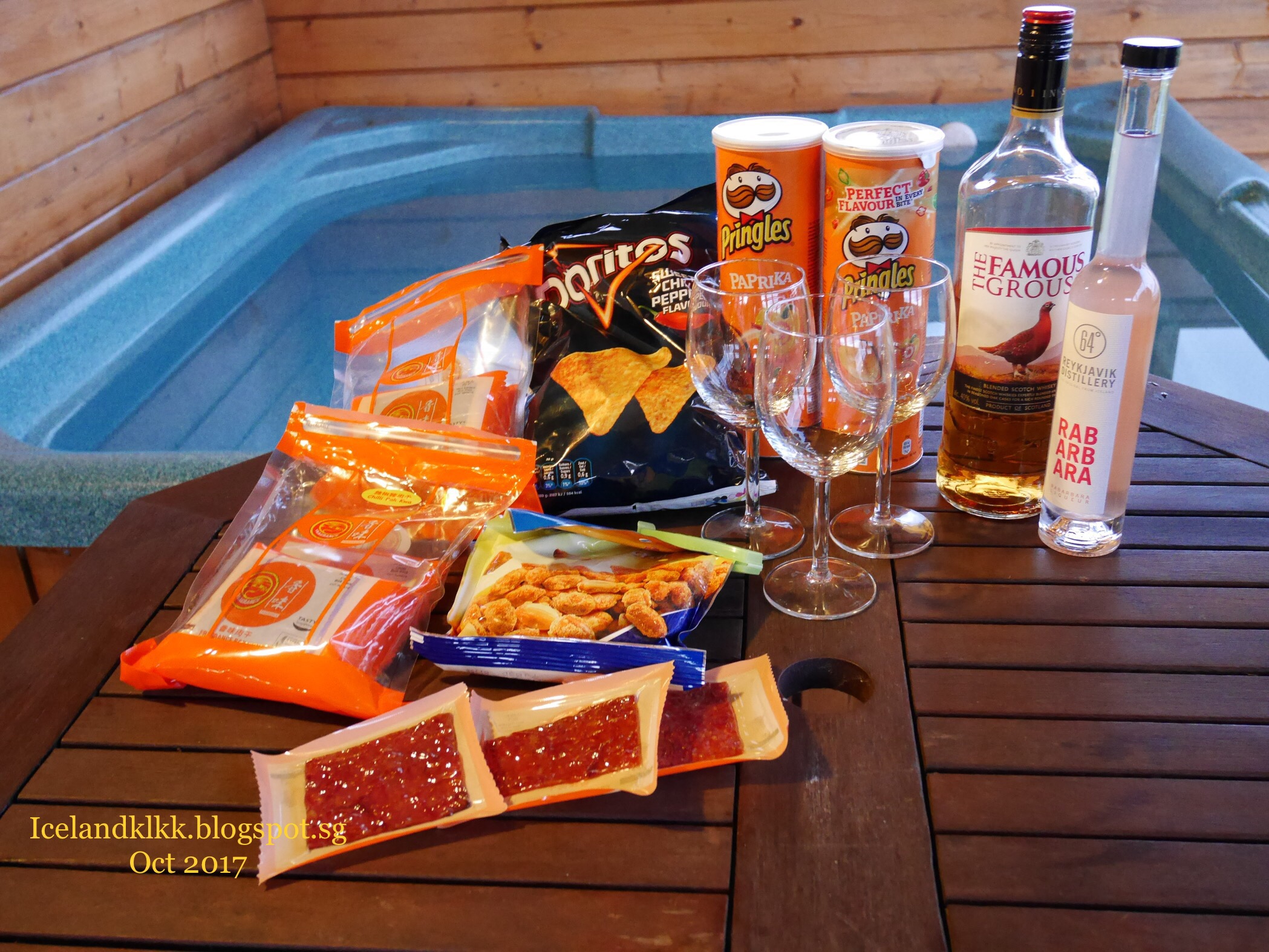 傍晚时分,开始我们的暖池庆祝会!这个池足以容纳4个大人,我们3个人泡着热汤、吃着零食和喝着酒,欣赏屋外的风景,真是人生一大痛快!