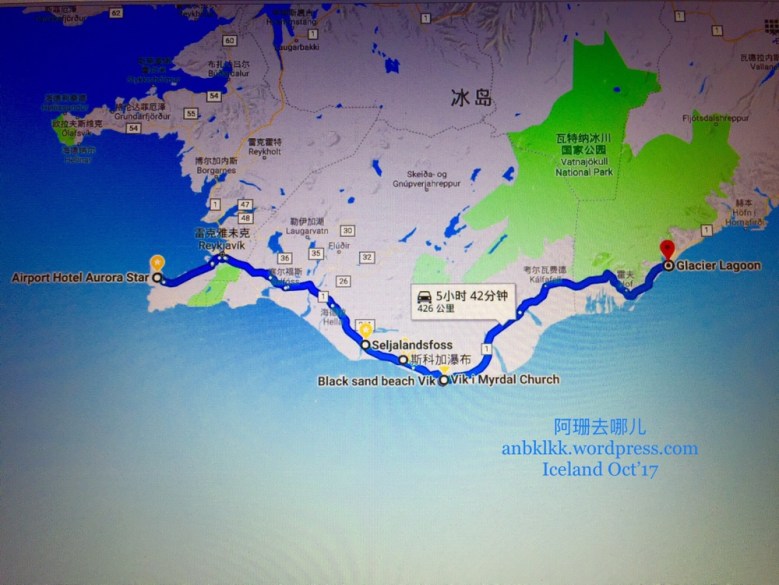 这里附上从机场酒店-》赛里雅兰瀑布-》斯科加瀑布-》黑沙滩-》(维克教堂,Sudur Vik餐馆)-》杰古沙龙冰河湖共426公里路程的地图: