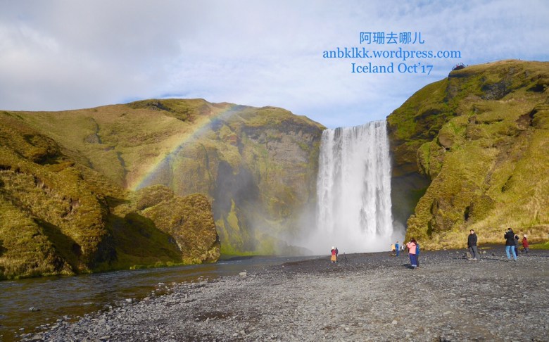 依山傍水的Skogafoss比起喷水雾的Seljalandsfoss , 拍照相对地轻松些。拍着拍着,彩虹出现了!