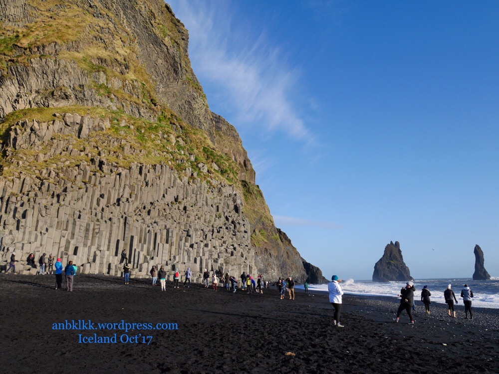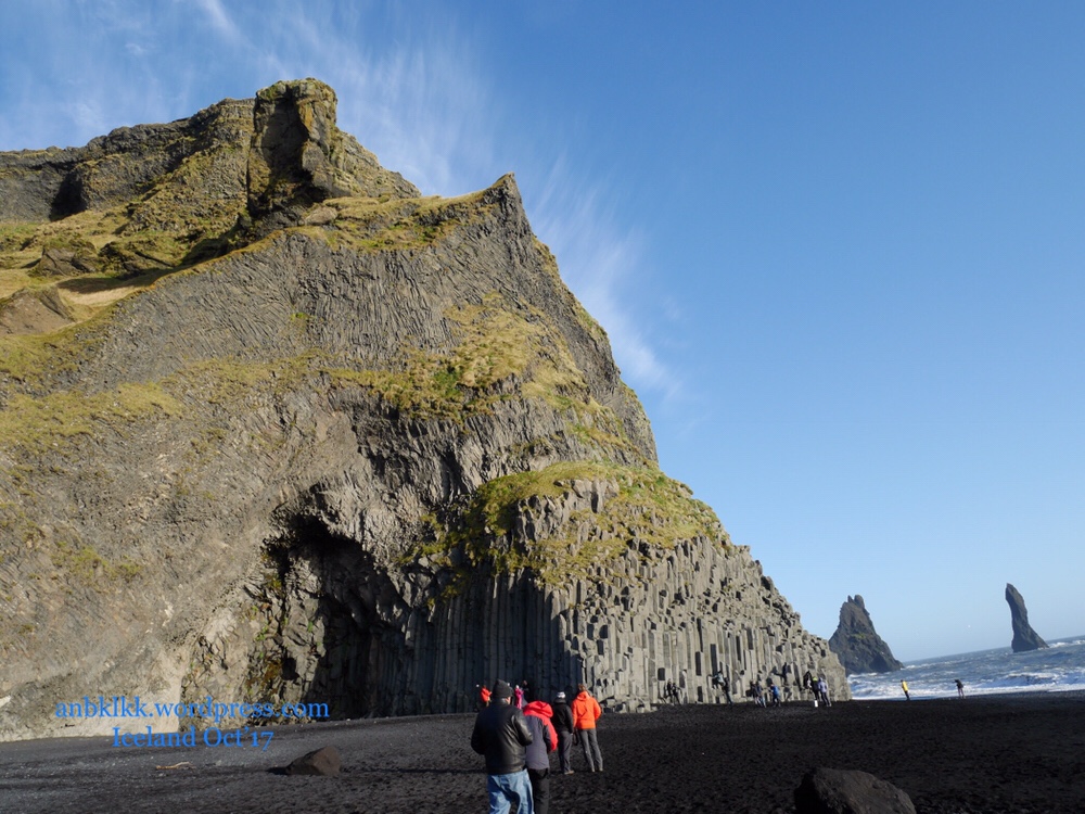 从Skogafoss 到黑沙滩大约50分钟的车程。冰岛处处都有黑沙滩,唯独维克镇Vik的黑沙滩最是壮观,加上被海水侵蚀的柱状石条,非常独特,1991年被列为“世界最美的10大沙滩之一”。