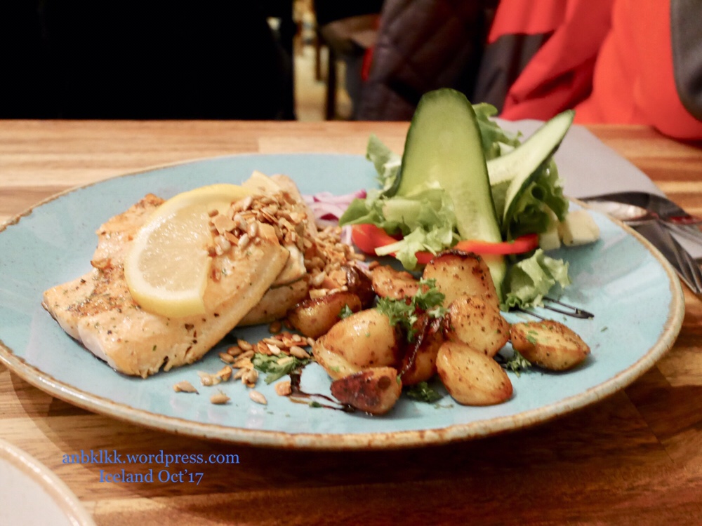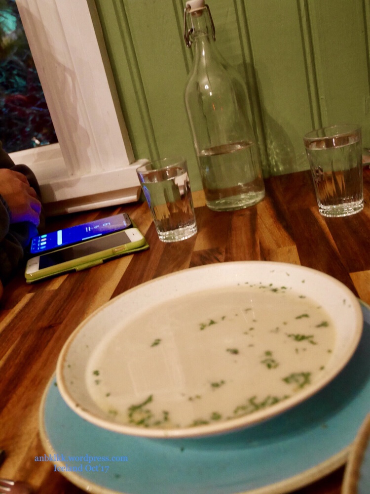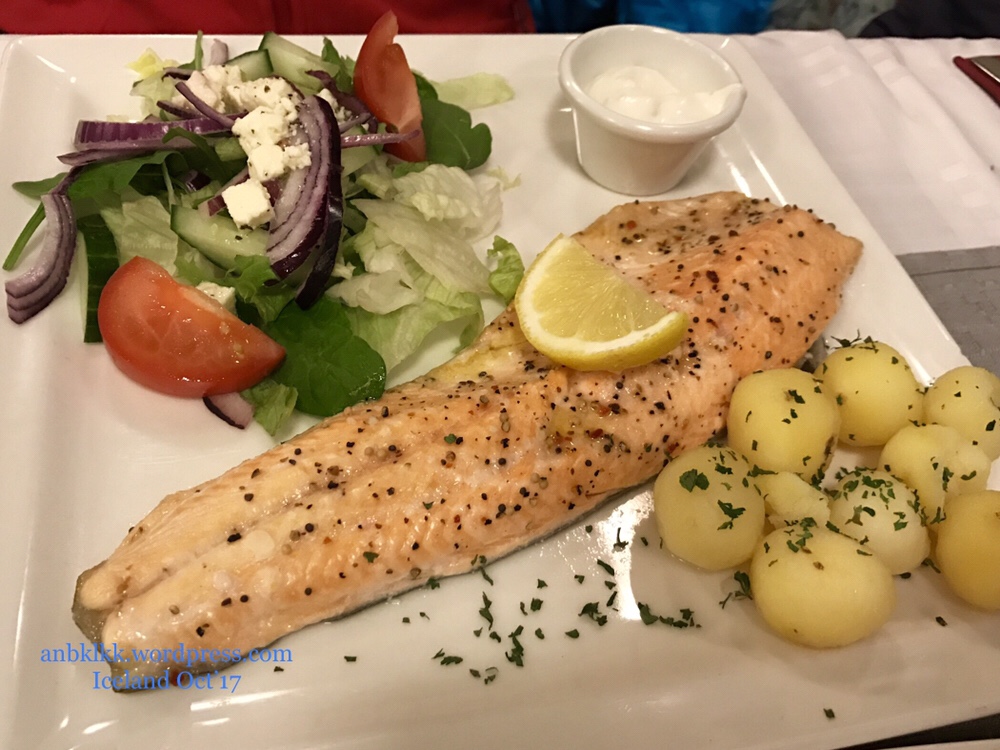 我们点了:羊肉汤lamb soup, 三文鱼套餐 arctic charr,龙虾大套餐lobster tails ( ISK 11 550, Sgd $153)