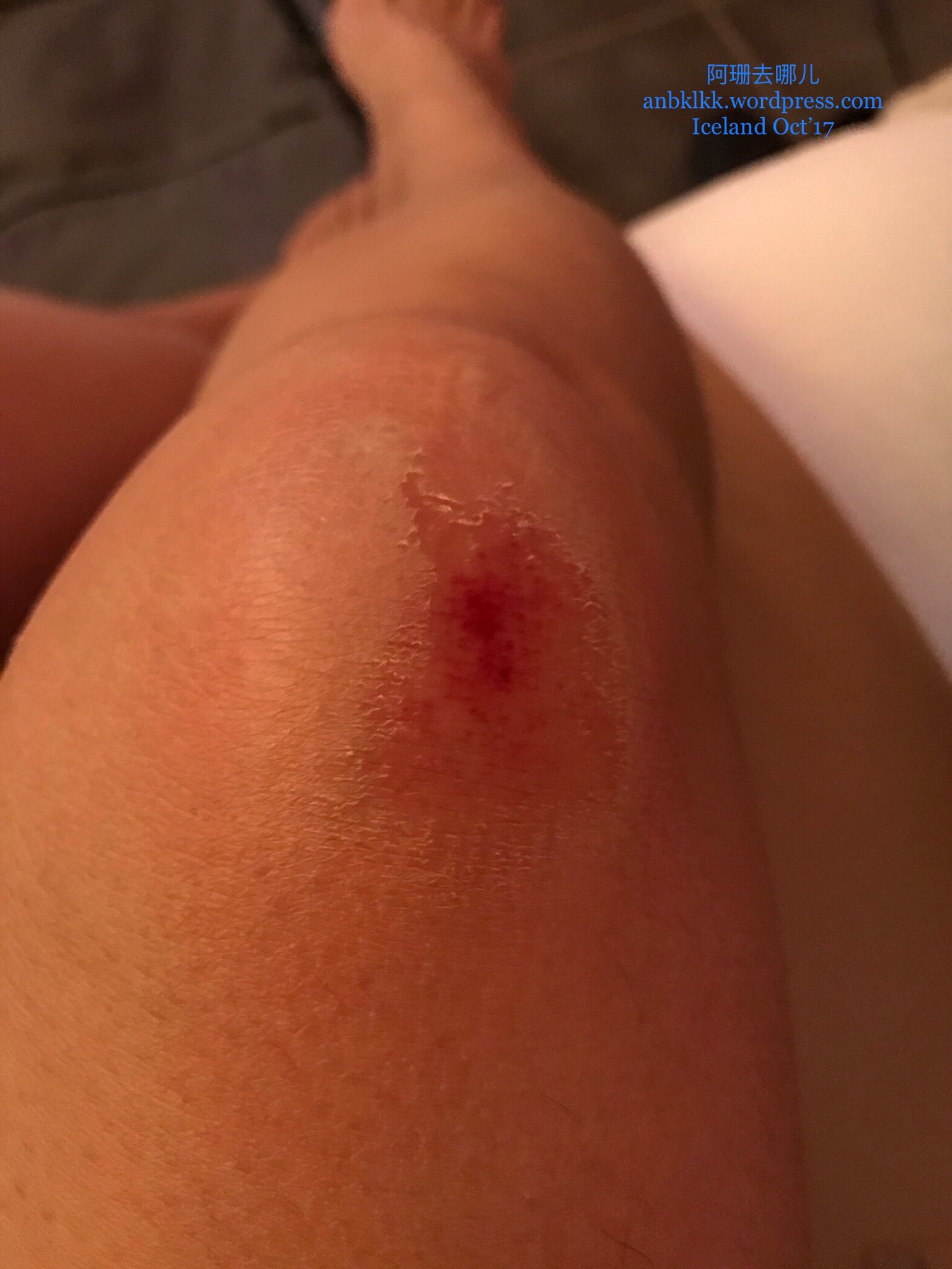 看看这膝盖的伤,是一层牛仔裤加上一层加厚毛绒裤双层保护下摔的,可见撞击力有多大!还好一只脚只是瘀伤,而这只破皮的,贴上🆗绷后,又是一条好汉!这趟旅程甜酸苦辣,尽在其中。