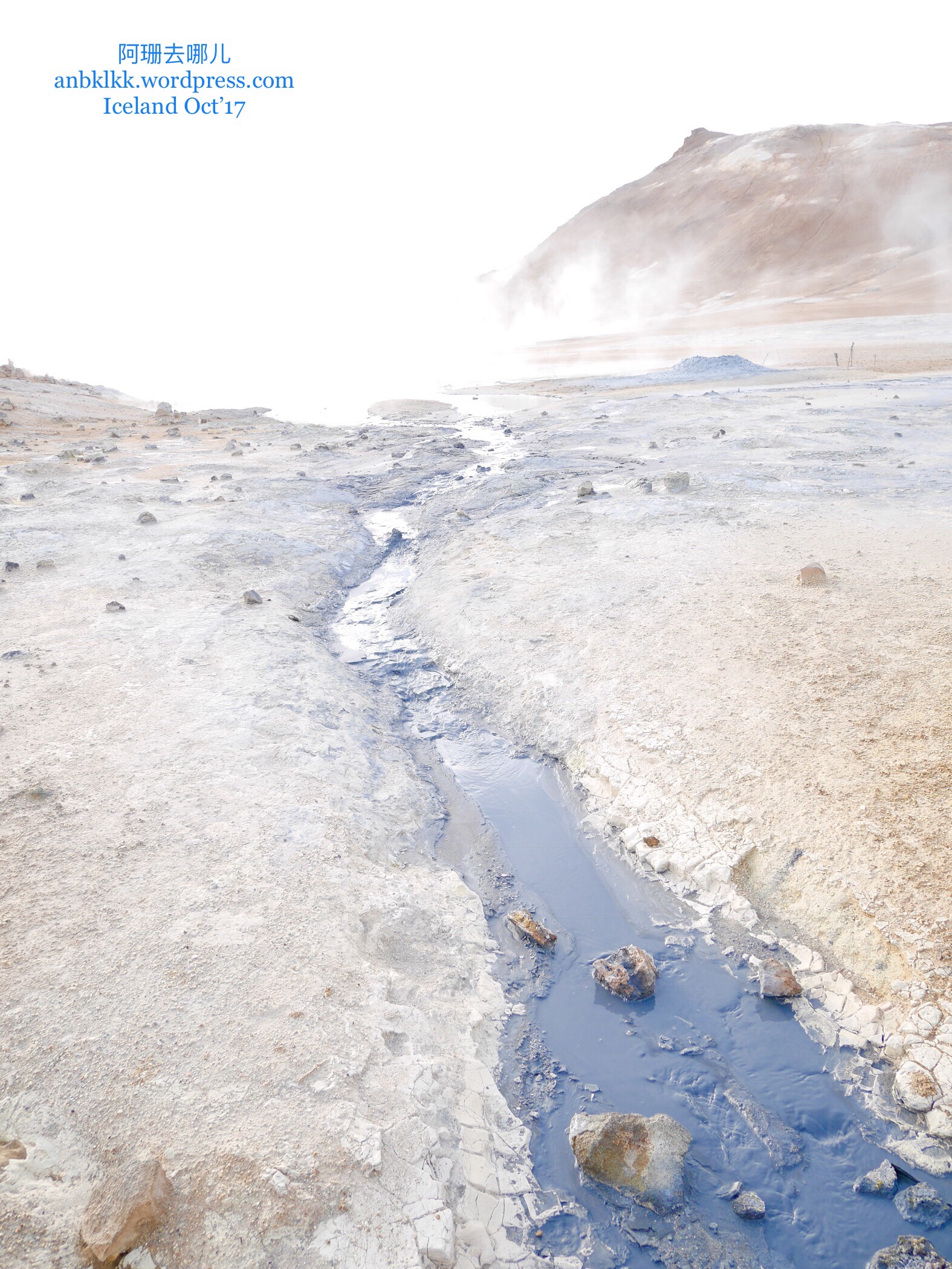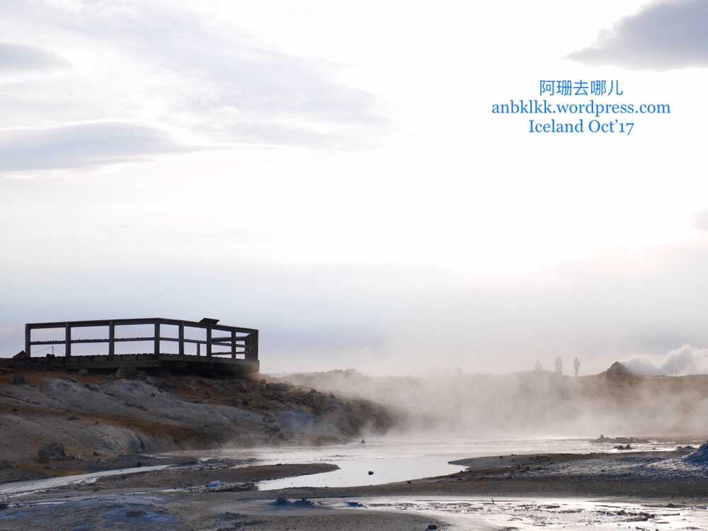 地热谷的范围不算大,一个小时左右就能把这地方拍好。唯一要注意的还是保暖,还有不时要抹一抹被水雾弄得濛濛的镜头。在这里送上地热谷的视频,听见的声音是风,飕飕的风声就像在欢迎来到此地的游客!来过的,便会了解为什么阿珊站在入口处就想打退堂鼓走人,没来过的就请看看视频:看那吹向我们的白烟,没有温度却带有硫磺的味道,记得把音量调至最大,听一听北欧冷风的呼啸声。。。。。。