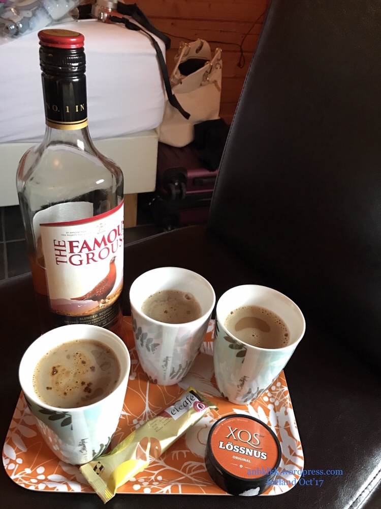 回到车里,马上开暖气,喝一喝温水,当身体和手暖和一些后才开车。由于当天的行程只剩地洞温泉和米湖温泉,我们便开车回到Vogafjos旅馆休息一下。下午茶时间:阿珊把烈酒加进人参咖啡里,变成whiskey coffee,味道跟咖啡馆喝的一样,人生处处有惊喜!