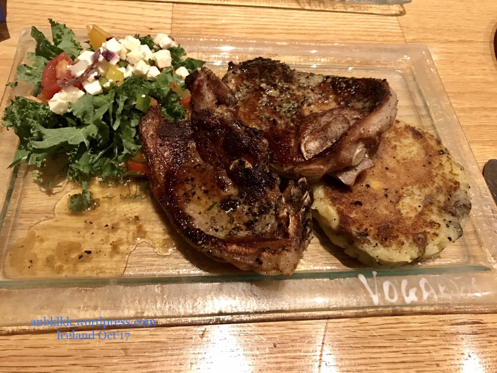 夜晚的米糊温泉馆只售卖着一些三文治之类的快餐,我们便开车回到Vogafjos Exp ,点上三文鱼套餐,羊扒和店家自制蛋糕,三文鱼依旧新鲜好吃,没有羊骚味的羊扒嫩滑不已。店家的蛋糕配上鲜奶cream,香滑而不腻,真好吃!当晚的晚餐花费ISK 10 260, SGD 136