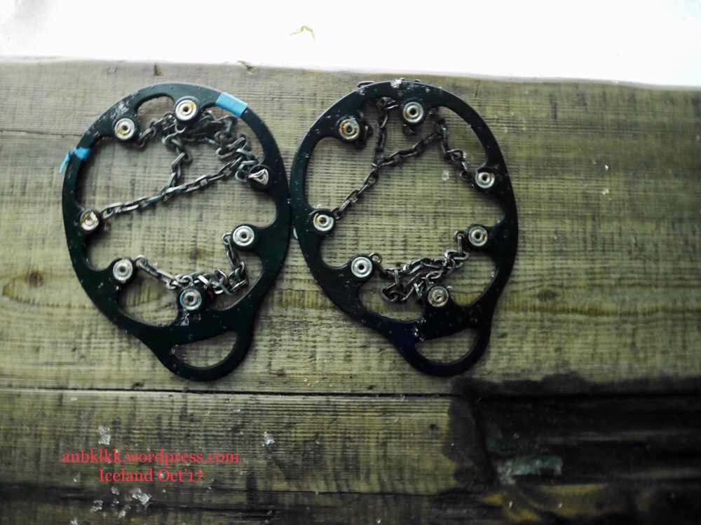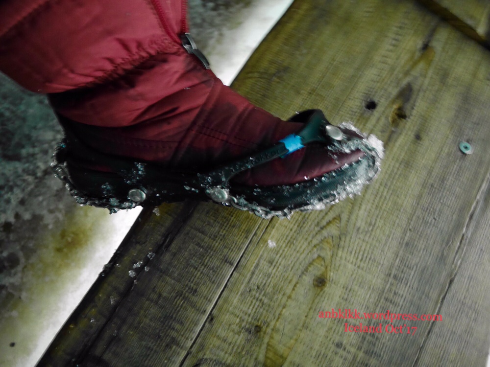 隧道里只没有风,只剩冰冷的温度还有不时滴落的水滴声。我们穿的鞋必须防滑和防水,步行约100米,向导从潘多拉的盒子拿出神奇的钉鞋套。这个套很容易穿,一套上,鞋子的防滑能力便提高了。