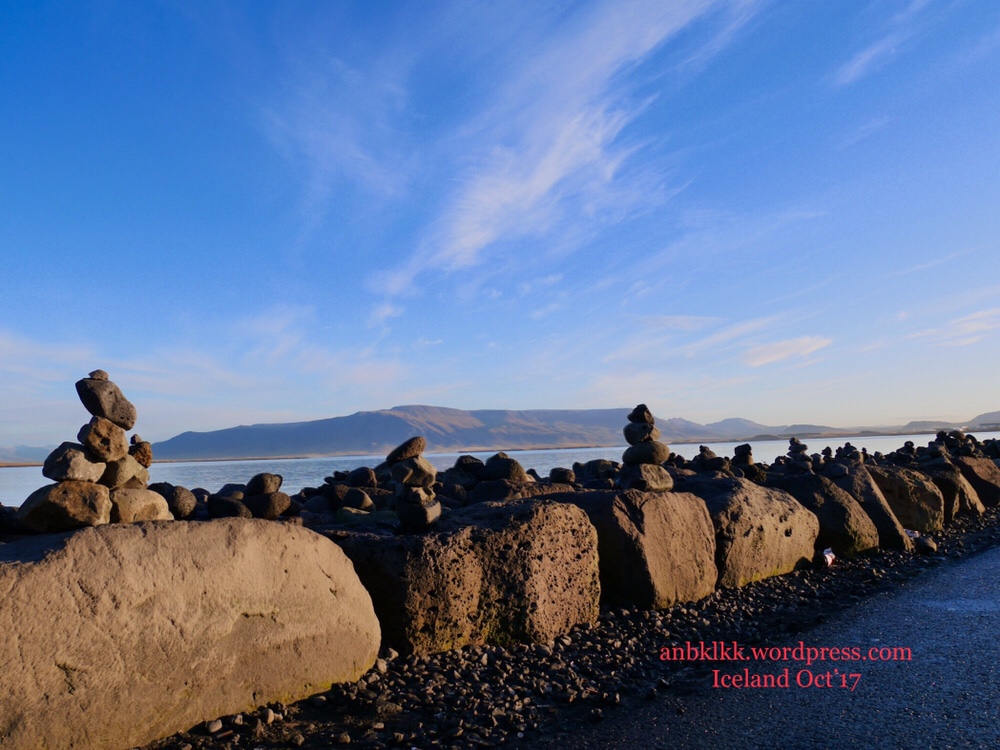 别称:维京船骨架雕塑。于1990年建成。维京人是冰岛人的祖先,海盗船所在地是历史上第一批维京人登陆冰岛的地方。这是Reykjavik重要地标。海边堆砌的石墙,咋看又像是古代打仗用的“石阵”!早上凉风习习,沿海风景宜人。我们三剑客背着晨光,摆出pose,把我们的的影子留做记录。