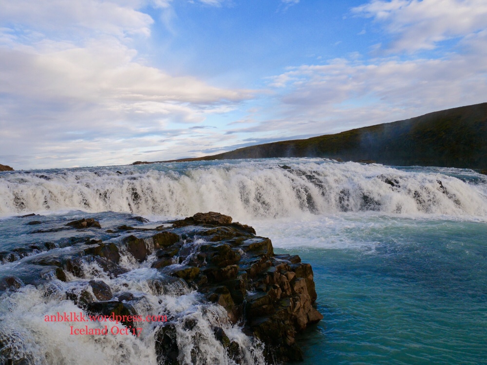 从Geysir往北10公里路,阳光下,在蒸腾的水雾中,布满闪着金光的点点水滴,亮艳的彩虹若隐若现,仿佛整个瀑布是用黄金造就,故而得名:黄金瀑布。这是冰岛人最喜爱的瀑布。宽2500米,高70米,是冰岛最大的断层峡谷瀑布,塔河在这里形成上下两道瀑布,下方河道变窄成激流。