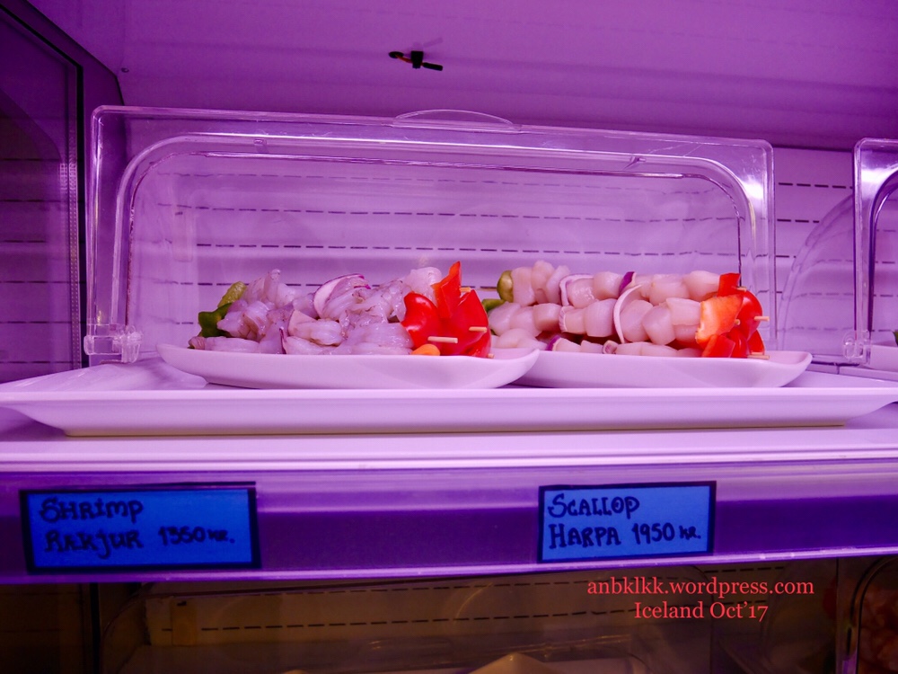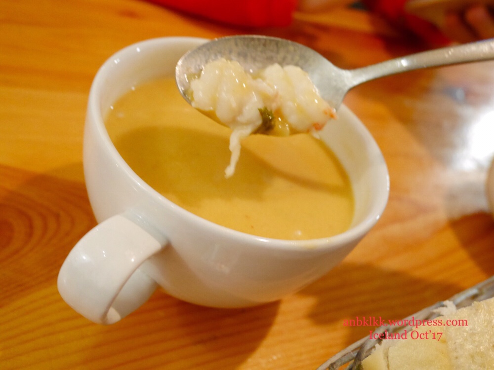 我们点了鲜虾,三文鱼和鳕鱼串烧,浓浓的热龙虾汤,加上新鲜的龙虾,那热汤喝得真痛快!还有那新鲜的海鲜烧烤,一会儿就把它们解决了!女女还加了一份yogurt mix fruit,她说这是冰岛独有的冰岛yogurt,应该试一试。吃饱后,我们慢步走回民宿。