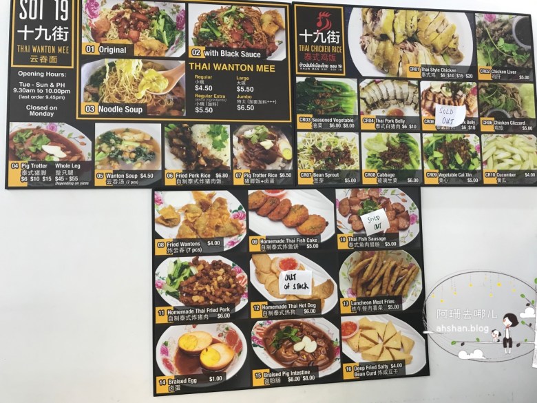 Soi 19 十九街的食物价格公道,云吞面有原味,黑酱油或者云吞汤面,价格介于小碗$4.50, 大碗$5.50或者特大碗$6.50。猪脚饭加上卤蛋一碗$6.50。店里还有售卖其他食物如泰式鸡,炸云吞,一些清炒菜等。