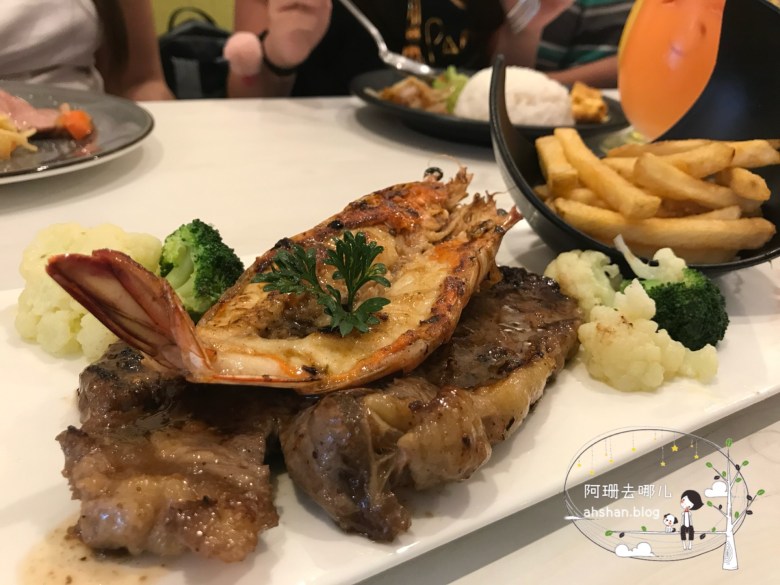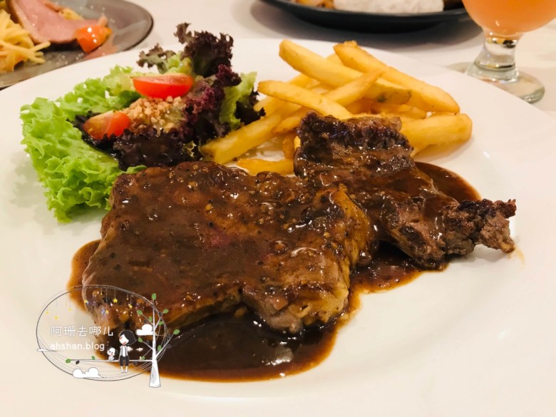 再来一份黑胡椒肋眼牛排Grill Rib Eye Steak with Black Pepper Sauce。我们点了全熟的(因为小孩也要吃),这份牛排不带血丝,口感香嫩,那黑胡椒酱汁香四溢,这牛排色香味满分!
