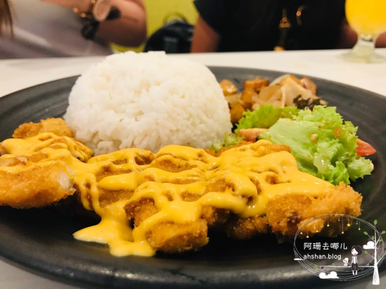 还有芝士炸鸡排饭Cheezy Chicken Rice,那片炸到金黄色的鸡排,加上淋到满满芝士酱,摆盘看似简单却非常有心思。鲜嫩多汁的鸡排,咬下时会发出“卡兹卡兹”的声音,那脆脆的口感是吃炸鸡排的一大享受!