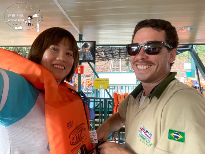 在那里可以把东西寄放在储物柜,没记错的话租一次(R$ 7)。我们可以选择干或湿两种船游。干的是坐在橡皮艇到瀑布前近距离欣赏瀑布;湿的是坐穿穿过瀑布,挑战什么叫“冲瀑”!这一次我们选择“干冲”,哈哈!乘搭这个升降台到河边,穿好救生衣,船游开始!