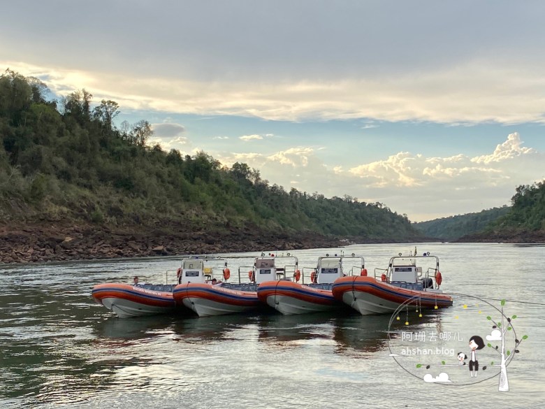 工作人员说现在属于旱季(跟2019末亚马逊森林大火有关,因为没有下雨),水位不高。看到岸边的石头有着明显的水位记号,平时的水位都有盖过那些石头。我们坐的橡皮艇穿过伊瓜苏河是有时会撞到河底的石头,水位低的缘故吧。靠近瀑布时,水雾直接冲向我们,非常爽快!看见前面的水流吗,如果“湿游”的话就会冲过那层瀑布!