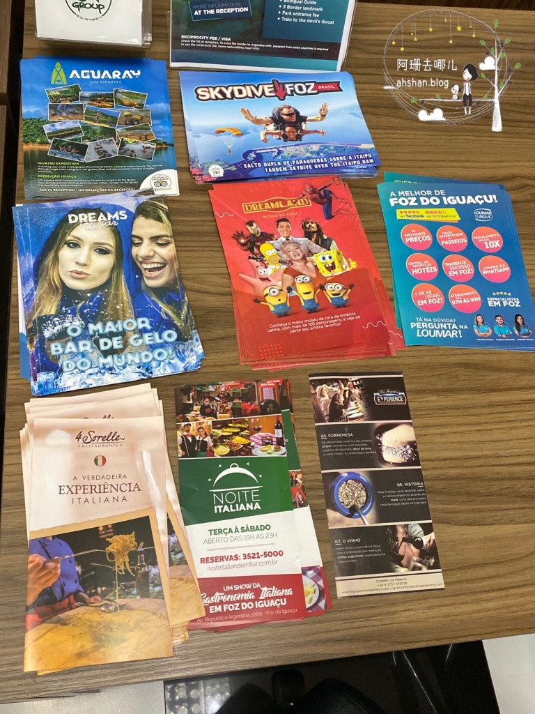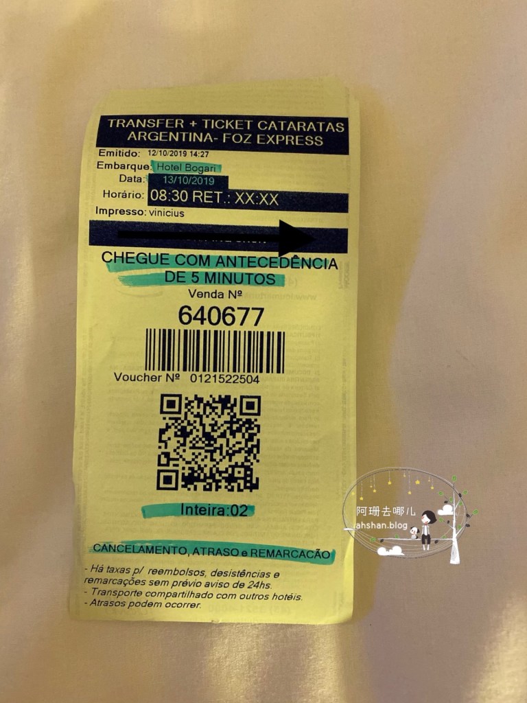 酒店安排载送服务,到酒店check in后,已是2点多了。看见酒店接待处前面设有当地旅行团柜台,有解说员向我们推荐当地旅游配套。我们当场签下2天伊瓜苏瀑布的配套,包括当日巴西侧伊瓜苏瀑布/伊瓜苏国家公园+船游Foz-do-Iguacu/Foz-do-Iguacu-Macuco-Safari-Experience和明天的阿根廷伊瓜苏国家公园一日游Foz-do-Iguacu/Argentinian-and-Brazilian-falls-Full-day-trip。这个配套包括当日的巴西伊瓜苏国家公园入门票+船游还有第二天的阿根廷伊瓜苏国家公园入门票+前往魔鬼咽喉(devil’s throat)火车票+巴西/阿根廷/巴拉圭三国交界处+来回交通+双语向导。以下是这两天的入门票: