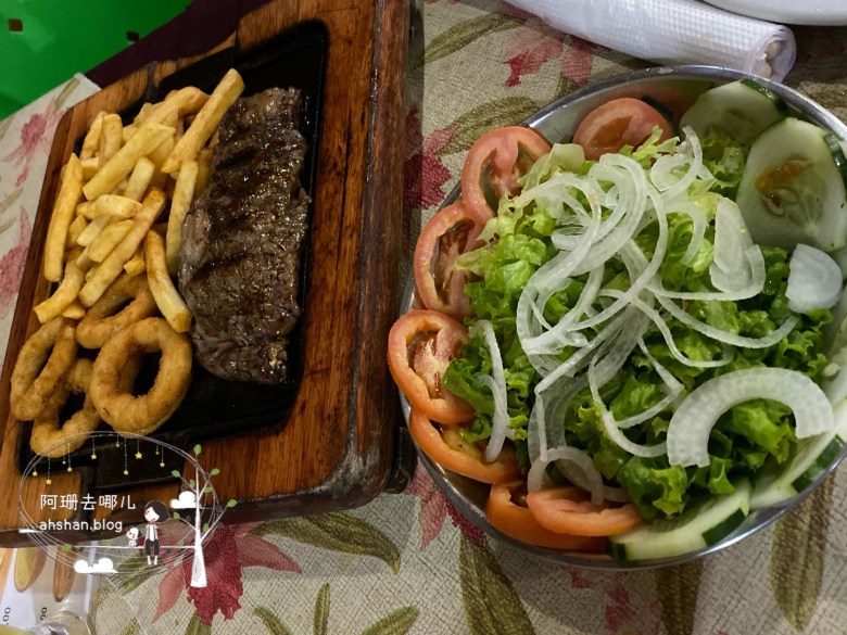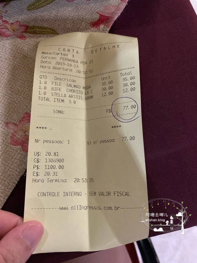 回房间放下包包,到酒店附近的餐厅吃晚餐。点了一份三文鱼套餐和一份牛扒套餐,巴西人的食量应该蛮大吧,每一份套餐都是满满的一大盘还有一碗白饭!我们尽量把重点吃完。之后到隔壁的药妆店买矿泉水,他们卖的矿泉水有两种,一种是普通矿泉水;另一种是苏打水。此外,在外面热了一整天,我的湿疹又发作,身体开始痒了,在药妆店顺便买了一支皮肤过敏药膏,涂了过后,症状才慢慢减轻。