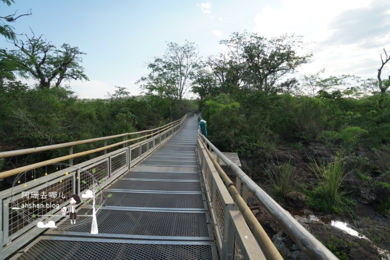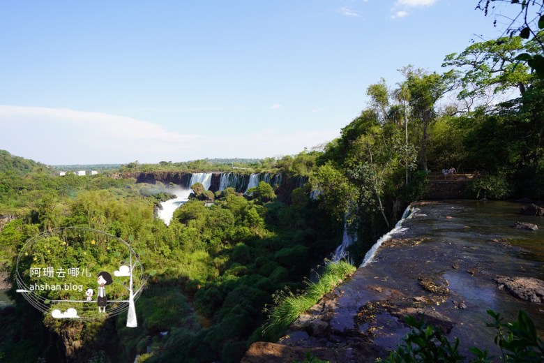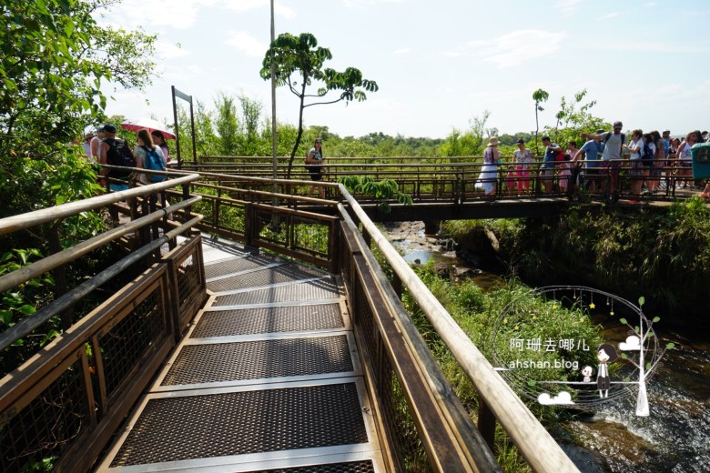 导游把3点半的火车票分给全部队友。我们继续前行,3点50分开始走Lower Trail Circuito Inferior步道(350米)。它其实跟巴西比较相似,主要是看伊瓜苏瀑布全貌。旱季的关系吧,只拿看见小瀑布们细水长流。半小时左右,开始走Upper Trail Circuito Superior(1750米),其实这个步道可以近距离接触伊瓜苏瀑布。此外这里还有另一个双流瀑布Salto Dos Hermanas,可惜在伊瓜苏园内微不足道。我们走到瀑布的上方,浅可见底,有点可怜的感觉。如果像平日雨水充足,我相信这些景观会完全不同!但是还是有身在侏罗纪世界的感觉。