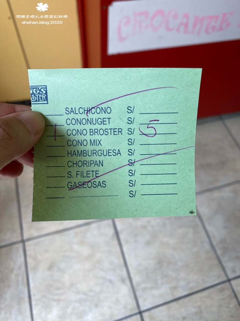 导览完毕,导游先行离开,我们跟着gps回旅馆,半路看到一家快餐店,跟店员比手划脚地买了一份炸鸡和汽水Inca cola。回到旅馆check in,把行李搬到房间,那是第二楼层的房间,没有电梯。我们艰辛地把行李扛上楼,这时才感受到海拔2千多米的压力。简单梳洗一番,吃了炸鸡就准备下一个bus tour。