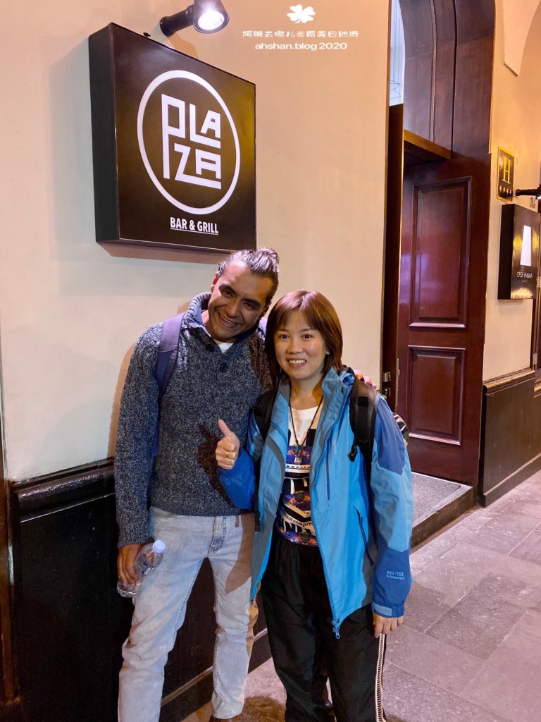 Food Tour的尾声来到Plaza Bar & Grill,这家餐厅座落在武器广场Plaza de Armas Arequipa的建筑物里面。从餐厅的露台一眼可以欣赏到阿雷基帕武器广场的夜景。在这里点了秘鲁国酒pisco sour,听听导游说着他的故事,从超过100公斤,没自信的大胖子因为跟女朋友分手后,每天下班后从阿雷基帕步行40分钟的路回家,就这样从100多公斤瘦到70多公斤。人瘦了,自信心也慢慢增强!也谢谢他的导览,让我们在短短的时间里更了解阿雷基帕的历史故事。