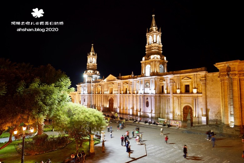 阿雷基帕圣殿主教座堂Basílica Catedral de Arequipa。是天主教阿雷基帕总教区的主教座堂,也是秘鲁自西班牙征服以来最著名的教堂之一。阿雷基帕圣殿主教座堂创建于1540年8月15日,阿雷基帕建城之日。经历过1844年的内部大火、1868年的地震之后严重损毁,最近一次的强烈地震发生於2001年,这场地震摧毁了其中一座白色尖塔,经过政府努力修复之后,於2002年底重现原有的殖民风貌。