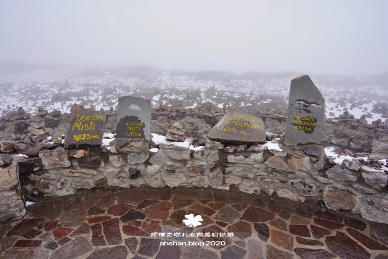 这是美洲安第斯山脉最高处的观景台,巴塔彭巴Patapampa,海拔4910米,外面有许多积雪,头又开始疼了。我们穿多一层外套才下车,这里有写着火山名字的石碑。细雨纷飞加上缺氧,我们拍完照就快快回到车上。